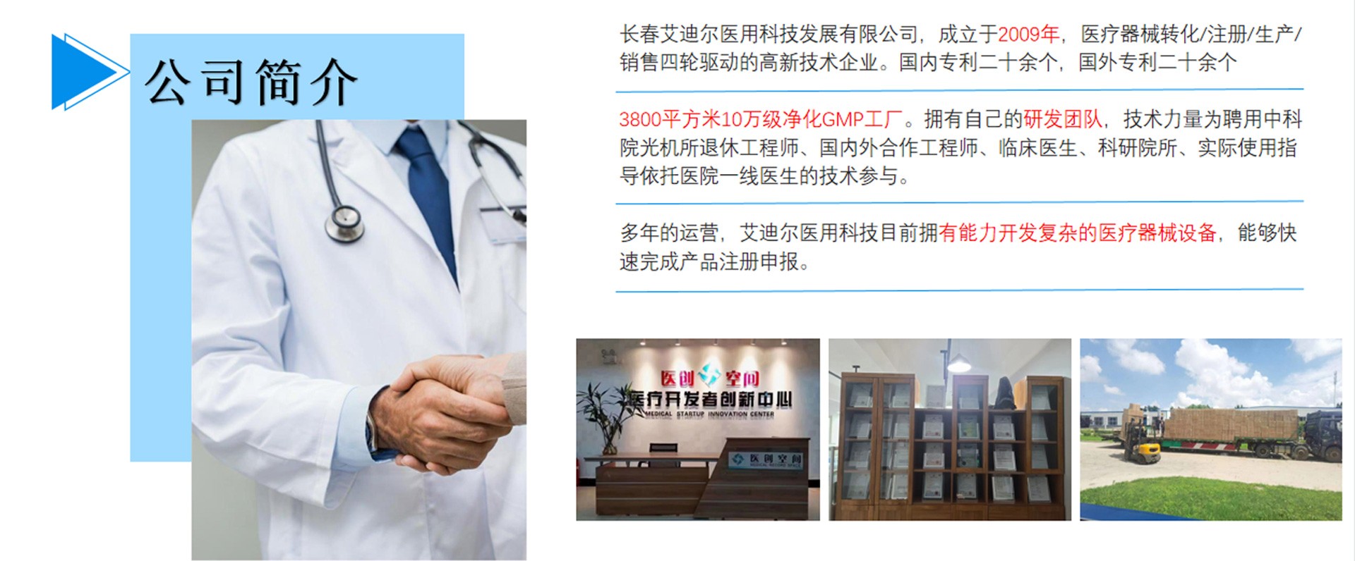 長(zhǎng)春艾迪爾醫(yī)用科技發(fā)展有限公司為集產(chǎn)(自有工廠); 學(xué)(多所院校科研課題合作單位);研(研發(fā)成果轉(zhuǎn)化注冊(cè))三位一體的高新技術(shù)企業(yè)。艾迪爾科技主要經(jīng)營(yíng)范圍為一次性醫(yī)療器械耗材的開發(fā),專注于抗菌肽新材料的開發(fā)和研制,以“IN-58抗菌肽一類新藥及原料藥注冊(cè)、激光類治療儀”兩個(gè)核心優(yōu)勢(shì)技術(shù)為中心。公司擁有標(biāo)準(zhǔn)GMP車間及健全的質(zhì)量管理體系,擁有多個(gè)已上市和即將上市的產(chǎn)品,包括睡眠、泌尿、口腔、肝膽、消殺、婦科六大系列產(chǎn)品線。公司擁有核心專業(yè)技術(shù)報(bào)批團(tuán)隊(duì),承接國(guó)內(nèi)外醫(yī)療器械專項(xiàng)成果轉(zhuǎn)化,具備自主研發(fā)能力及MAH服務(wù)能力。